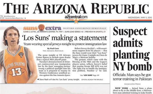The owner of the Phoenix Suns basketball team, Robert Sarver, opposes Arizona’s Immigration Law because he is fearful of the damage to gate receipts from a boycott of the Suns by NBA fans in San Antonio, Phoenix and Los Angeles, cities that are all heavily Hispanic. Three times last season he had his team wear “Los Suns” jerseys to appeal to Hispanic fans.